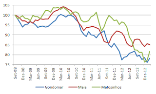 - Os valores absolutos da Maia e Matosinhos têm-se aproximado bastante nos últimos meses. De facto, se considerarmos o valor 100 em 2008, comparativamente, os preços em Matosinhos tiveram uma queda superior;