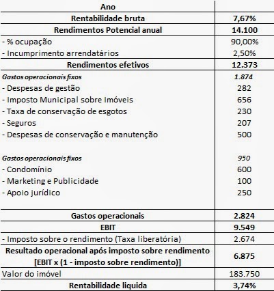 Tomemos o exemplo da maior rentabilidade obtida, de 7.67% numimóvel em Santa Maria dos Olivais, com um valor de venda de 183.750€: