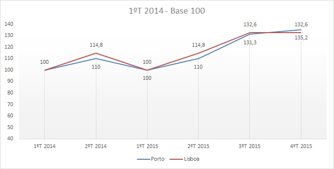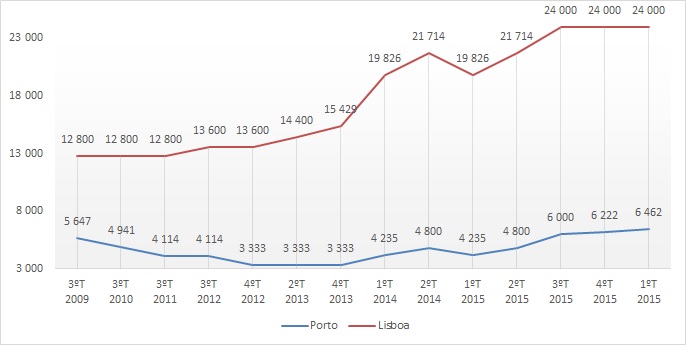 Ao analisarmos os elementos disponíveis desde que se verificou o início da crise é patente que Lisboa nunca verdadeiramente viu diminuir o valor dos seus imóveis, ao contrário do Porto, que sofreu uma diminuição considerável. Verdadeiramente, o Porto só assumiu valores iguais a 2009 no ano de 2015.